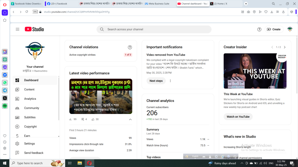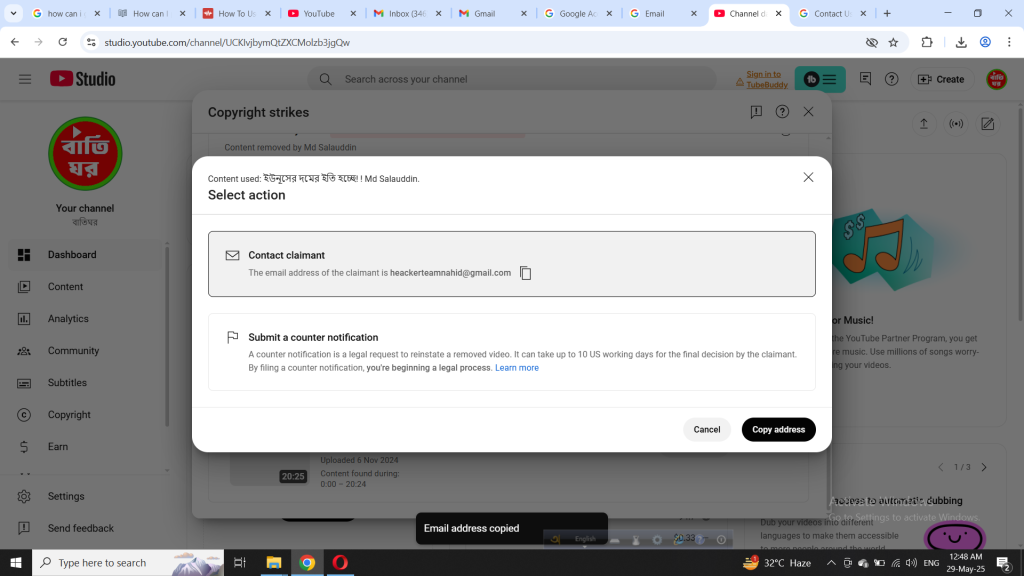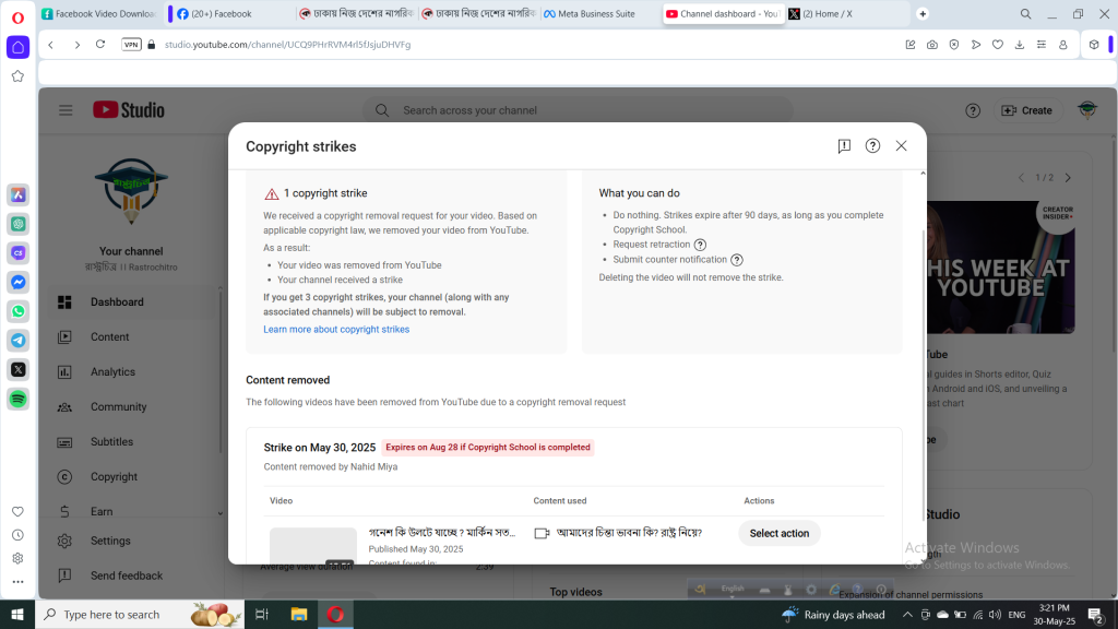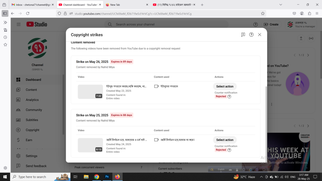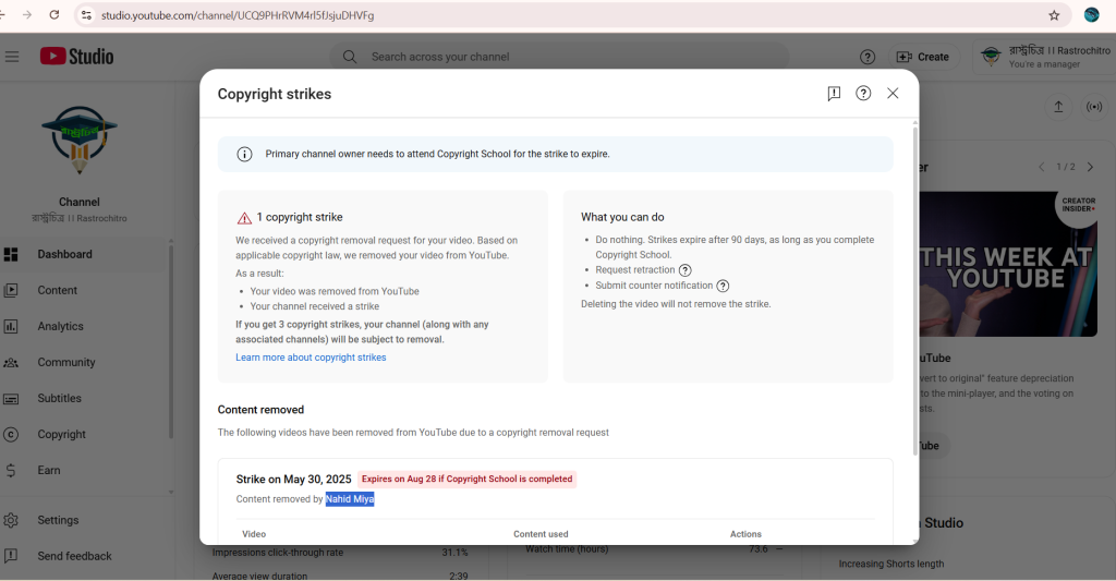 “আমার চ্যানেলটি তিনটি স্ট্রাইকে বন্ধ হয়ে যাওয়ার পর আমি আরেকটি চ্যানেল খুলি। সেখানেও একইভাবে একই ব্যক্তি ‘নাহিদ মিয়া’ আবারও তিনটি কপিরাইট স্ট্রাইক দিয়ে সেটিও বন্ধ করে দেয়।”